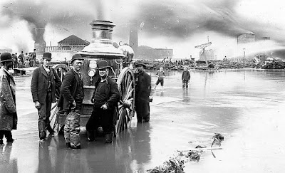 | Crew of men pose next to Titusville’s steam-powered fire hose pumper |