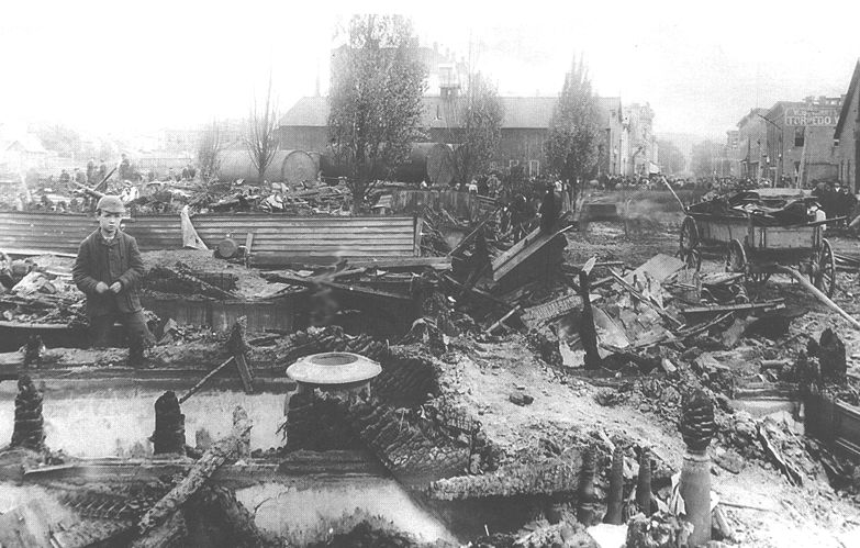 Just as this frantic throng had started up Centre street a second explosion occurred, knocking many people down, shattering the windows in the main part of the town, and almost transforming the day to night with an immense covering of smoke. Hundreds thought the day of judgment had come and many prayers were heard mingled with moans and lamentations. The heat was intense, and the awful spectacle presented to the panic stricken people was that of a cloudburst of fire, bordered and over-capped by a great canopy of dense black smoke.