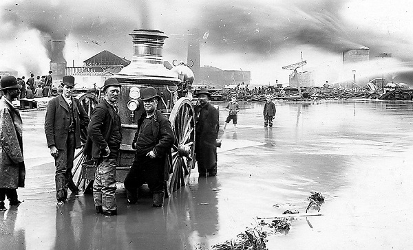 Clinging to the driftwood, timbers and other debris they were borne onward down the stream were scores of human beings, their white and terror stricken faces and desperate struggles and cries for aid combining to create impressions never to be forgotten. About one hour from the time the Crescent Works took fire another alarm was sounded. Oil on the creek, spilled by the water overturning a tank located some distance up stream, had taken fire, and the expanse of creek for a number of acres square was all a solid blaze, and the sky was filled with dense and pitchy clouds of smoke arising from the smoldering ruins of refineries, cooper shops, furniture factories, radiator works, hotels, railroad warehouses, cars and dwellings.