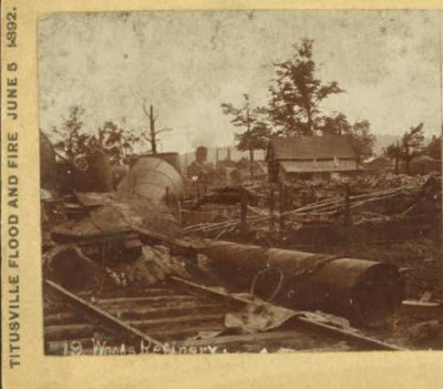 Fully one-third of the business and residence portion of Titusville is in ruins. The terrible flood rushed through the streets. Brave men with ropes tied about their waists breasted the terrible current rescuing the unfortunates who patiently awaited their return. A little four year-old boy, just brought to shore from the wreck of a handsome residence was placed in the hands of friends. When asked where his parents were he replied with a sob, “Papa and mamma both drowned.”