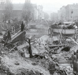 An eye witness at the time of the first explosion stood at the east end of the bridge. Almost as quickly as the words can be written fully 5000 persons in that portion of the town were on the streets, wild with terror, rushing to the hills. Men forgot that they were men, and scores of men, women, and children were knocked down and trampled upon both by horses and persons in the mad flight for safety.