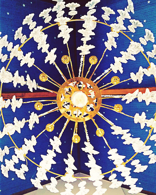 This chandelier hanging from the starry ceiling of the Saint Hippolytes church in Frenchtown, near Guys Mills, Pennsylvania was donated around 1888 by Otthille and Lydie Bousson, two sisters from France who operated a shirt factory in New York City. The Bousson sisters amassed a fortune from producing high-quality shirts worn by the Astors, Vanderbilts, and even U.S. Grant. Eventually the two moved to the area, building a brick mansion between Frenchtown and Pettis, now aptly known as Bousson.